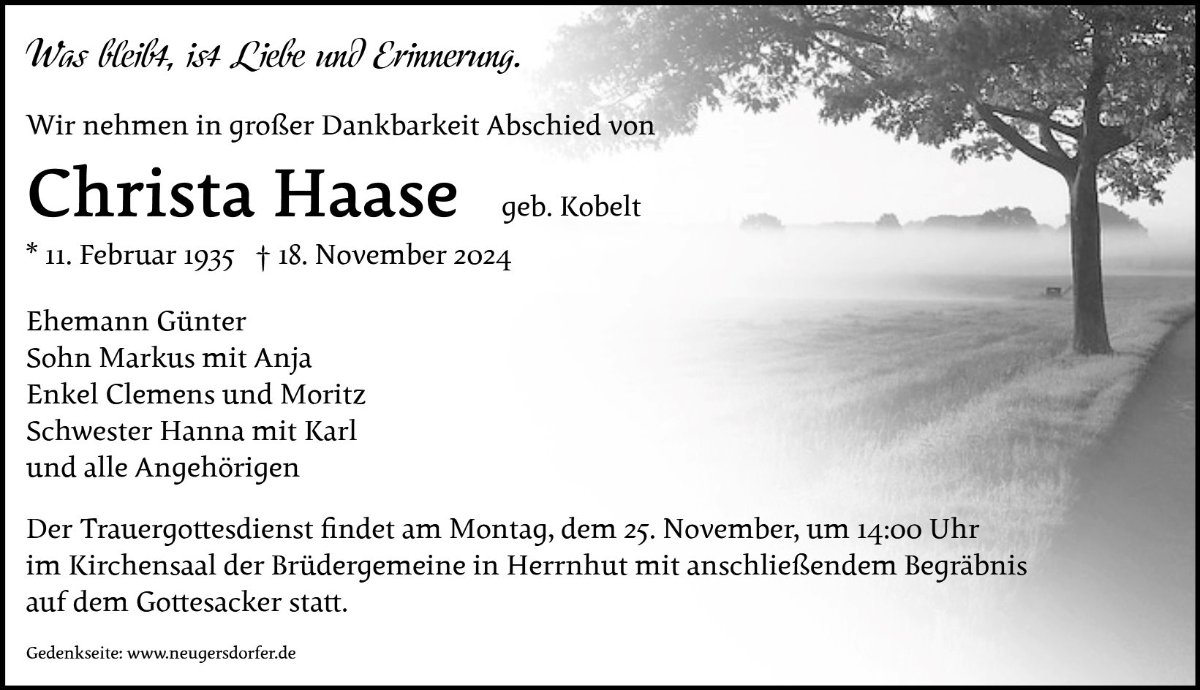 In stillem Gedenken an Frau Christa Haase.