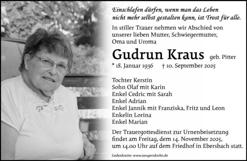 Liebe Kerstin,lieberBruder,liebe Enkel ! Unser herzliches Beileid zum Abschied von Eurer Mutter und Großmutter,meiner lieben gewesenen Kollegin Gudrun. Es tut mir unendlich leid,sie nicht mehr besucht zu haben.Euch alles Liebe.