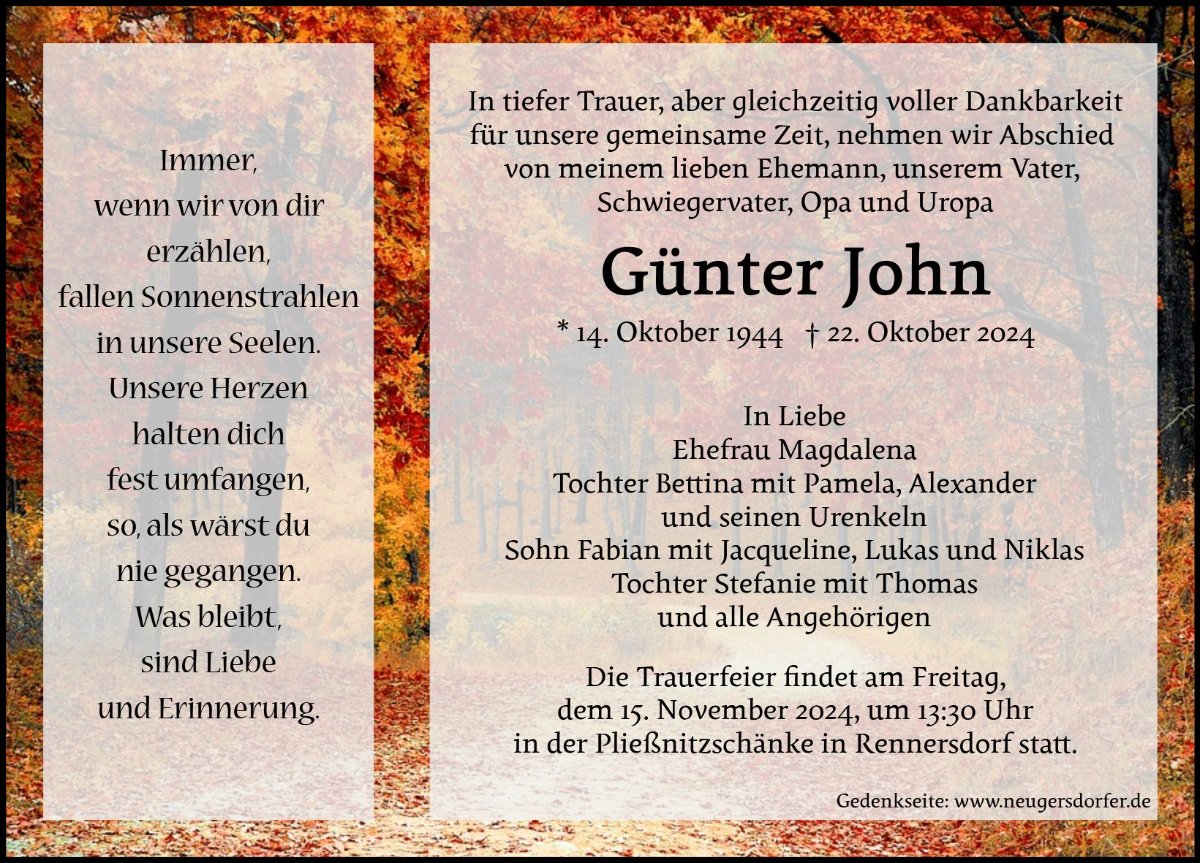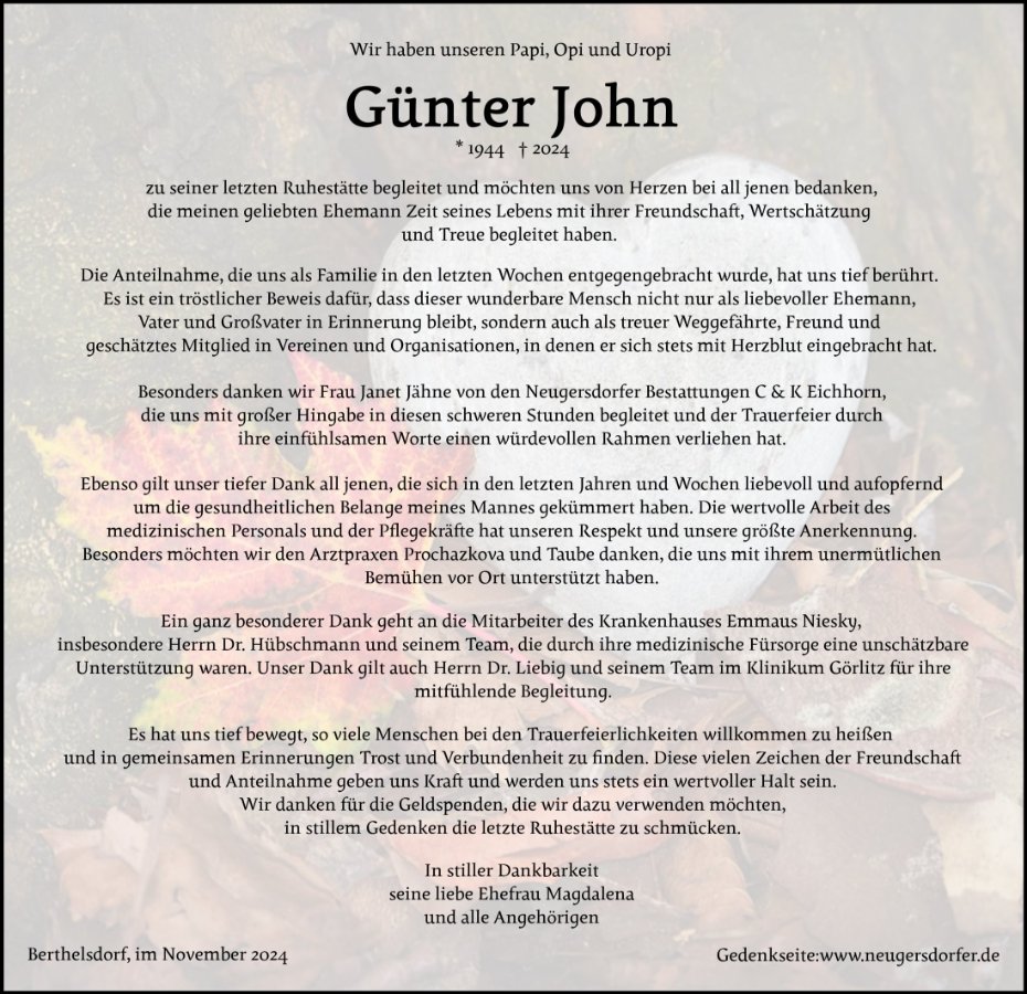 Mit großer Trauer und tiefem Schmerz haben wir vom Tod unseres Ehrenmitglieds, Wegbegleiters und Freundes Günter John erfahren. Kurz nach seinem 80. Geburtstag ist er von uns gegangen – ein Verlust, der eine Lücke in unsere Herzen reißt, die nur schwer zu füllen sein wird.