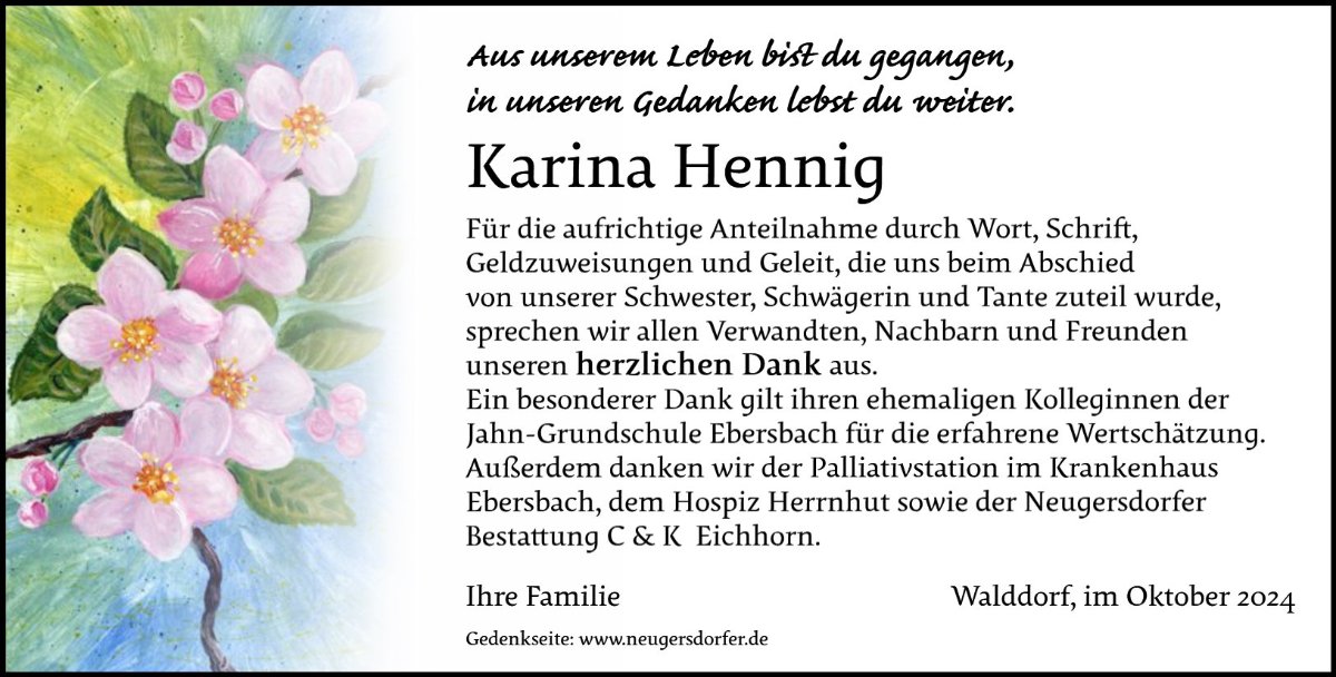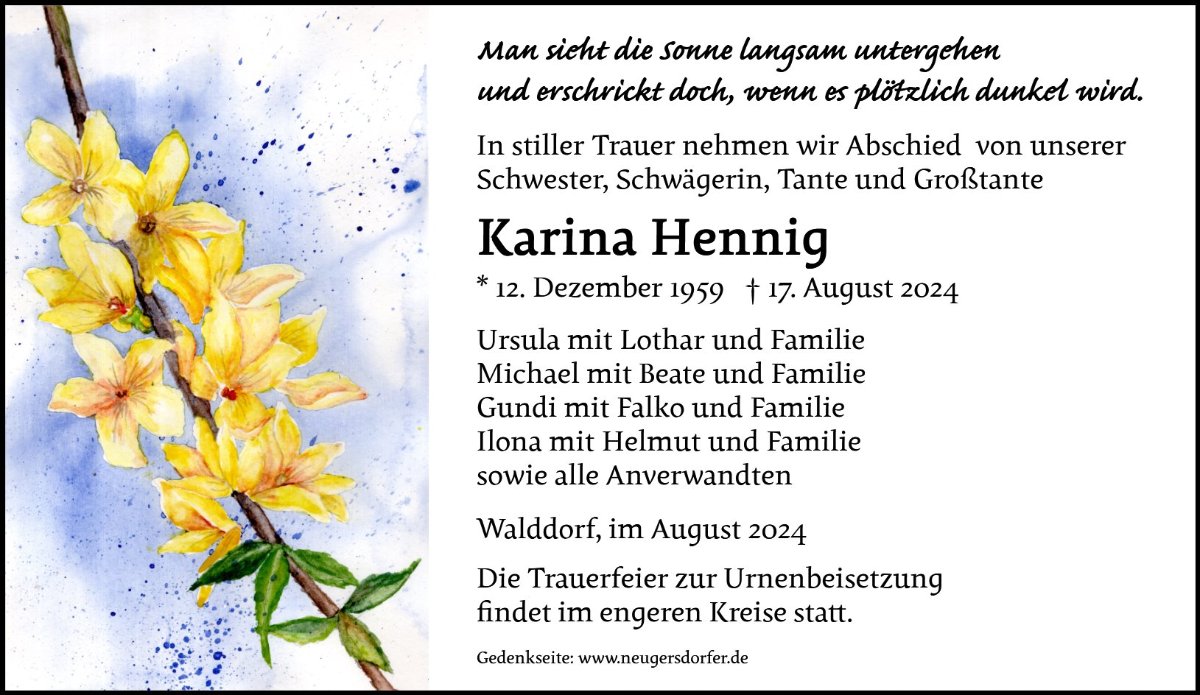 Immer wirst du mir, Karina, als besonderer Mensch in Erinnerung bleiben. Deine künstlerische Begabung, deine Neugier nach fremden Ländern, deinen Umgang mit den Kindern ... dafür habe ich dich bewundert. Und für deinen feinsinnigen Humor. Ein besonderer Mensch ist gegangen. Ich werde dich vermissen.