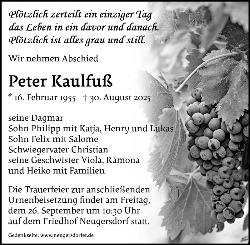 Lieber Peter wir kennen uns schon seit unserer Lehrzeit bei K-F-Rösler. Seit dieser Zeit hatten wir immer Kontakt. Bei meinen letzten Besuch bei dir, haben wir nochmals angenehme Stunden voller Freundschaft verbracht.